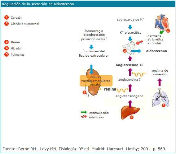 Los principales reguladores de la liberación de aldosterona son los niveles de potasio en el plasma y el sistema renina-angiotensina.